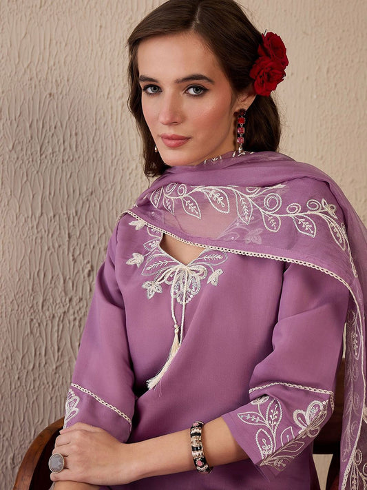 Dhiyona IE Lavender Floral Embroidered Thread Work Kurta with Trousers & Dupatta