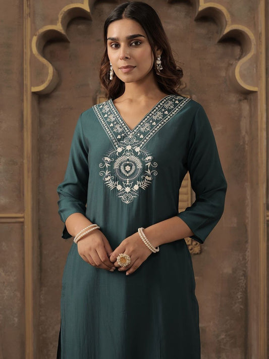 Dhiyona IE Ethnic Motifs Embroidered Thread Work Straight Kurta With Trousers & Dupatta