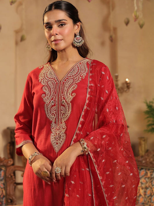 Dhiyona IE Embroidered Thread Work Straight Kurta With Trousers & Dupatta