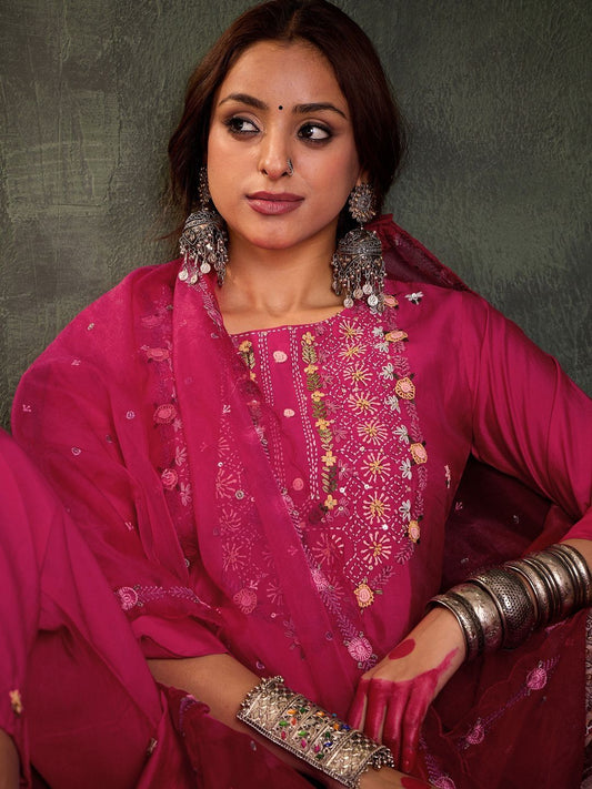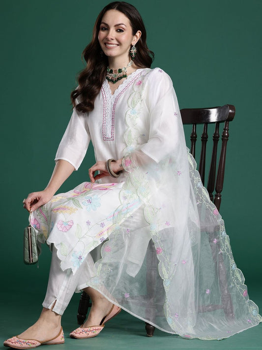 Dhiyona IE Floral Embroidered Thread Work Straight Kurta With Trousers & Dupatta