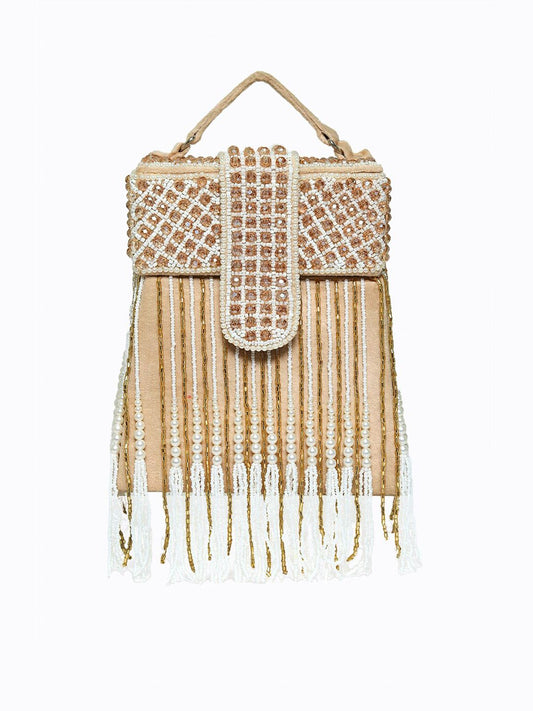 Dhiyona NR Dewdrop Fringe Camel Brown & Pearls White Ornate Embellished Velvet Potli