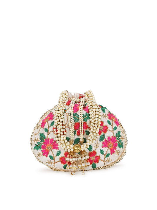 Buy 2 Get 1 FreeVendor:Dhiyona NRDhiyona NR Women Off White & Pink Embellished Tasselled Potli Clutch