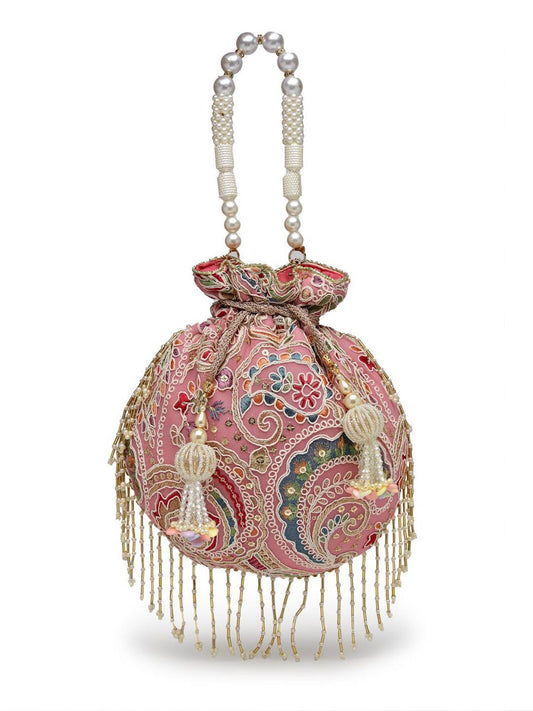 Dhiyona NR Dangle Baby Pink & Multi Abstract Embroidered Georgette Potli