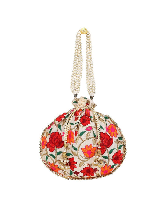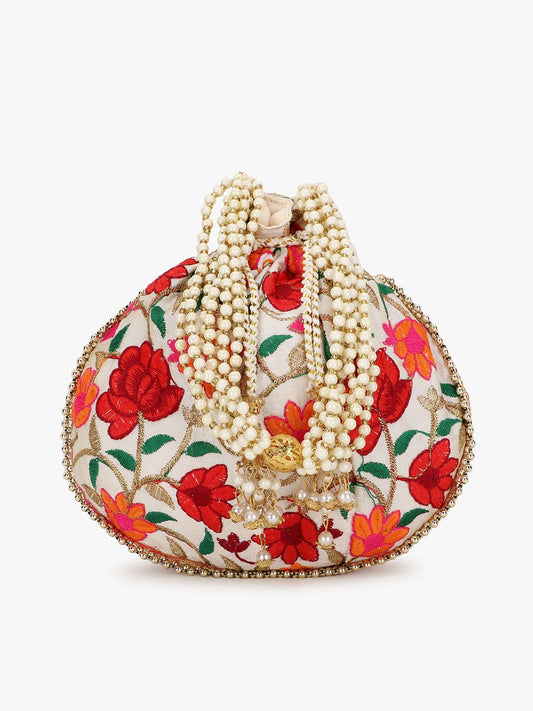 Buy 2 Get 1 FreeVendor:Dhiyona NRDhiyona NR Cream-Coloured & Red Embroidered Tasselled Potli Clutch