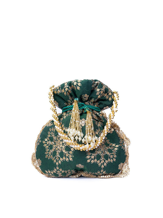 Dhiyona NR Green & Gold-Toned Embroidered Embroidered Potli Clutch