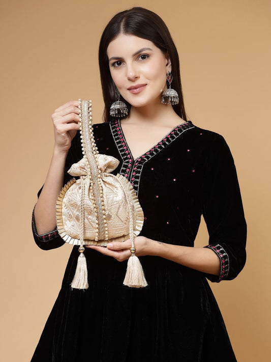 Dhiyona NR Black & Gold-Toned Embellished Tasselled Potli Clutch