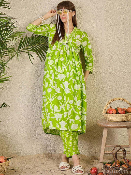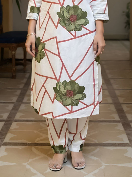 Dhiyona IE Women's Floral Printed Empire Pure Cotton Kurta with Trousers