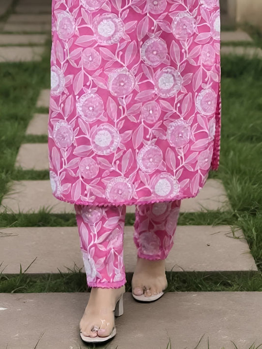 Dhiyona IE Women's Women Floral Printed Regular Thread Work Pure Cotton Kurta with Trousers