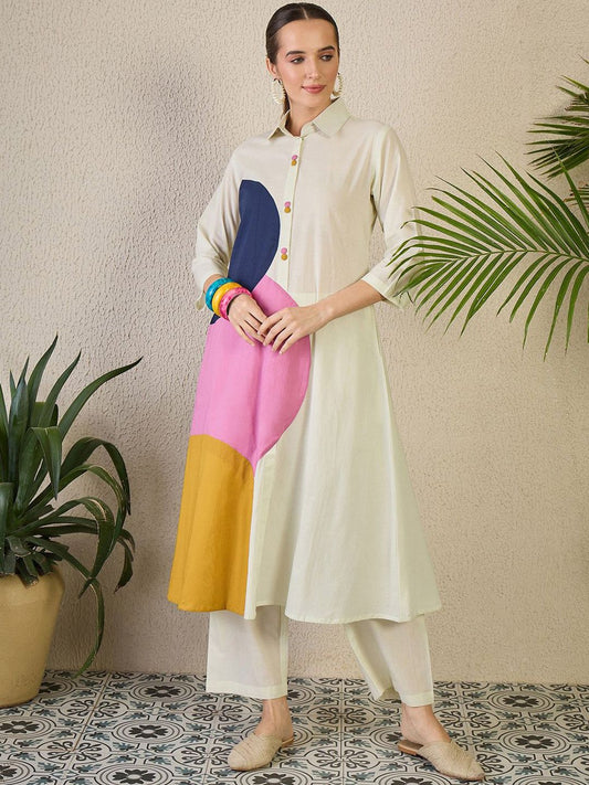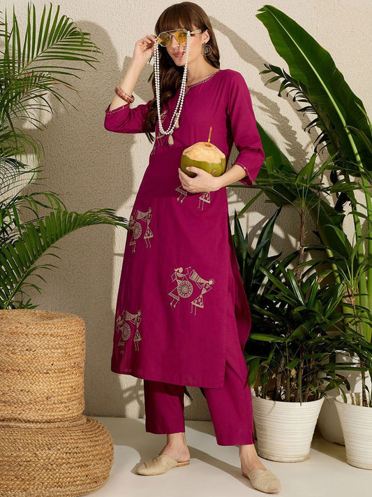 Dhiyona IE Women's Geometric Embroidered Tie-Up Neck Thread Work Pure Cotton Kurta & Trousers