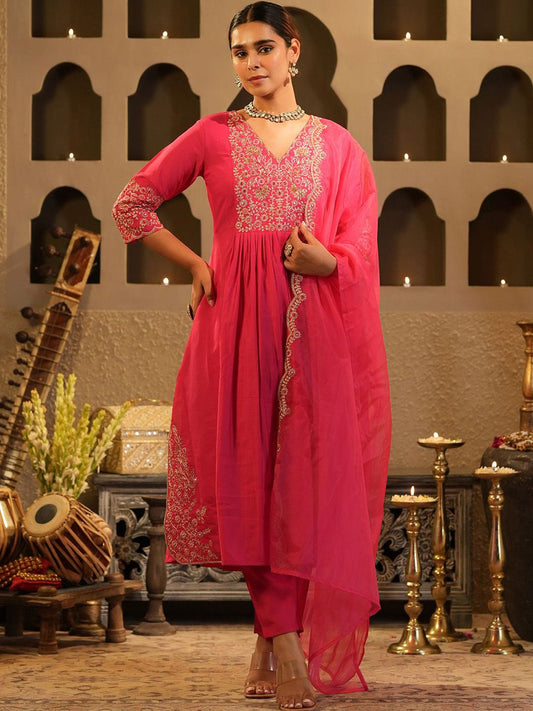 Dhiyona IE Women's Floral Embroidered Thread Work Organza Kurta With Trousers & Dupatta