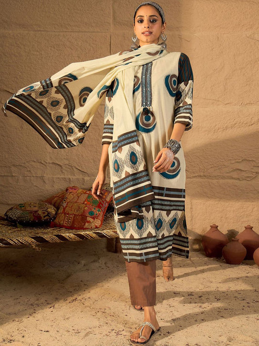 Dhiyona IE Women's Women Abstract Printed Cotton Kurta with Trousers & Dupatta