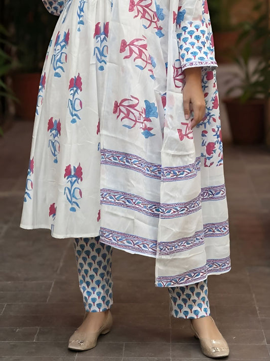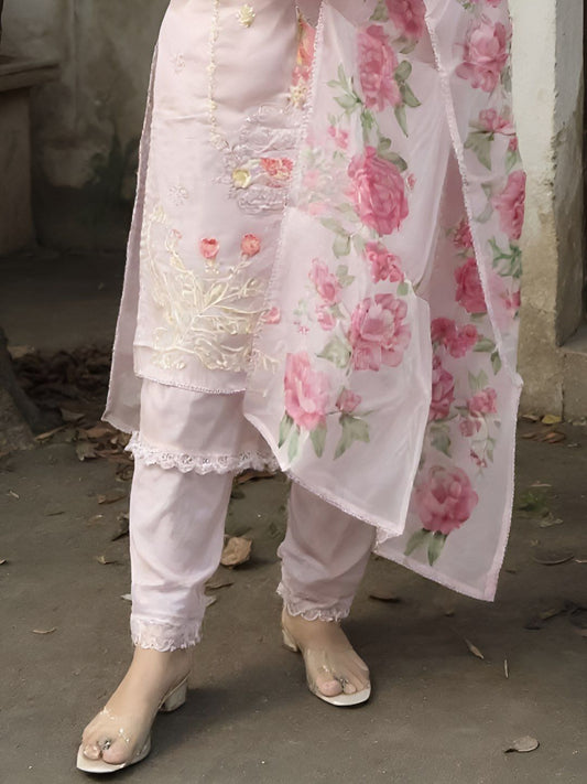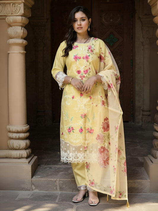 Dhiyona IE Women's Women Floral Embroidered Pure Cotton Kurta with Trouser & Dupatta