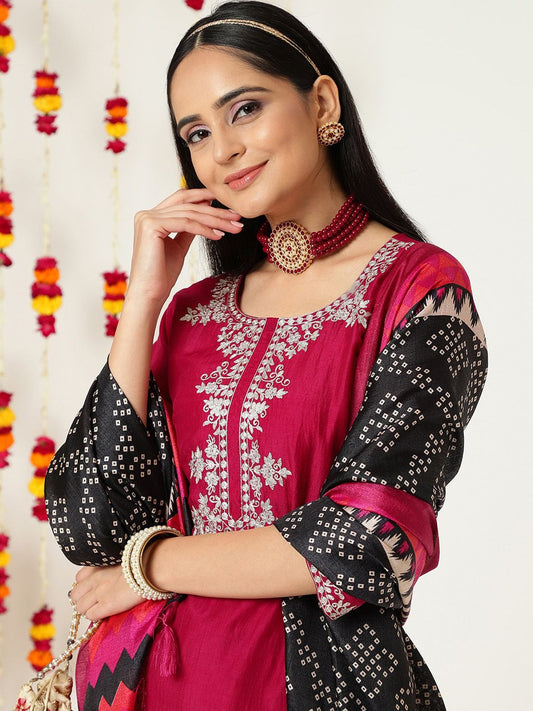 Dhiyona VA Women's Ethnic Motifs Embroidered Regular Chanderi Silk Kurta with Trousers & With Dupatta