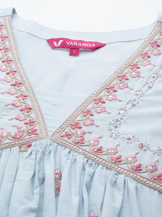 Dhiyona VA Women'sAlia Cut Floral Embroidered Empire Sequinned Pure Cotton Kurta With Trousers & Dupatta