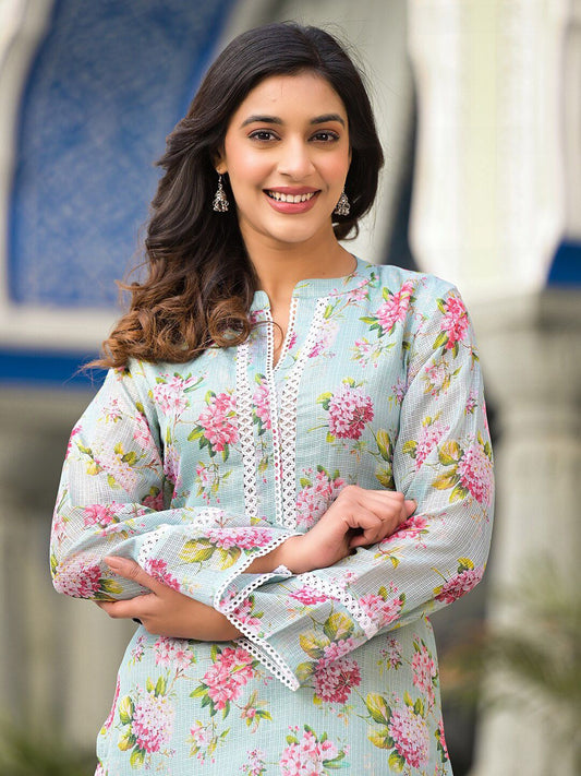 Dhiyona VA Women'sFloral Printed Long sleeves Calf Length Straight Kurta With Trouser