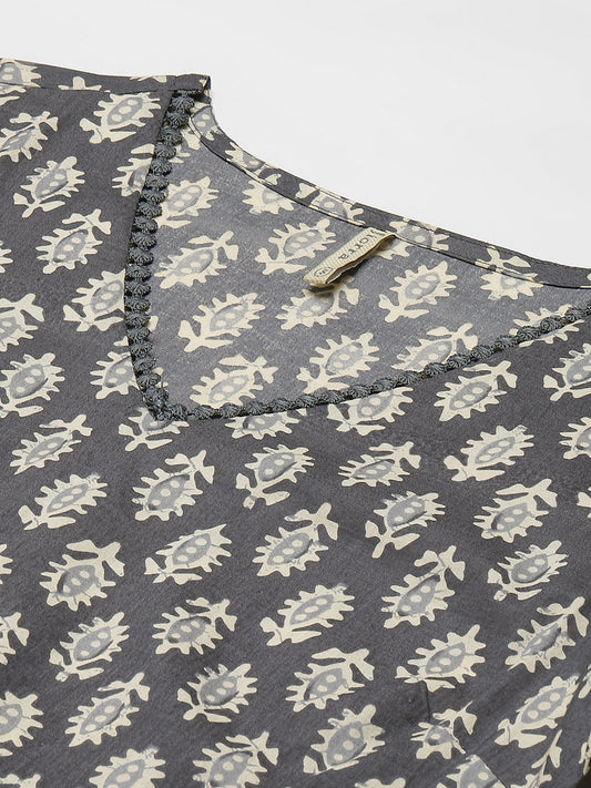 Women's Grey Cotton Straight Kurta with Pant and Dupatta