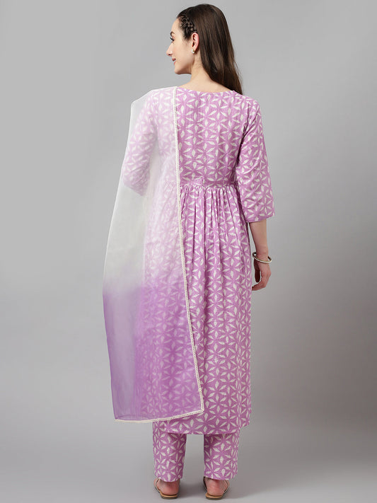 Women's Lavender Pure Cotton Flared Kurta Set With Dupatta