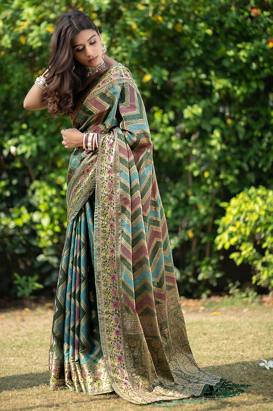 Dhiyona GR Women's Rangkat Lapis Lazuli Teal Leheriya Design Banarasi Organza Saree