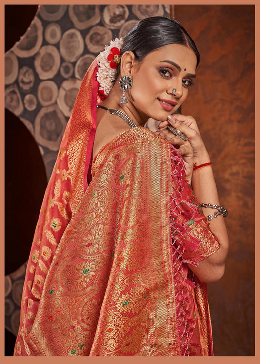 Dhiyona GR Women's Rashmika Tart Red Zari Woven Design Banarasi Organza Saree