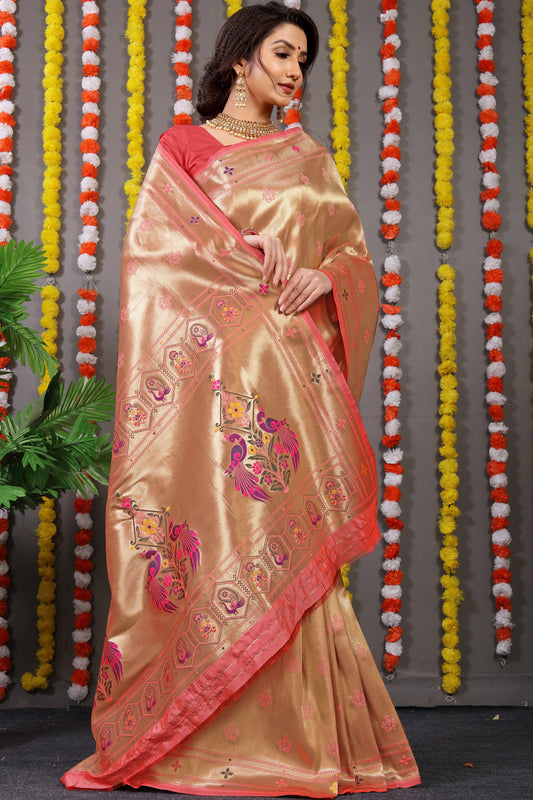 Dhiyona GR Women's Amrut Peachy Pink Zari Paithani Silk Saree