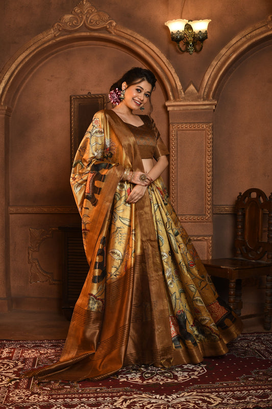 Dhiyona GR Women's Gold & Brown Soft Ghicha Tussar Silk Saree with Beautiful Kalamkari Printed Work