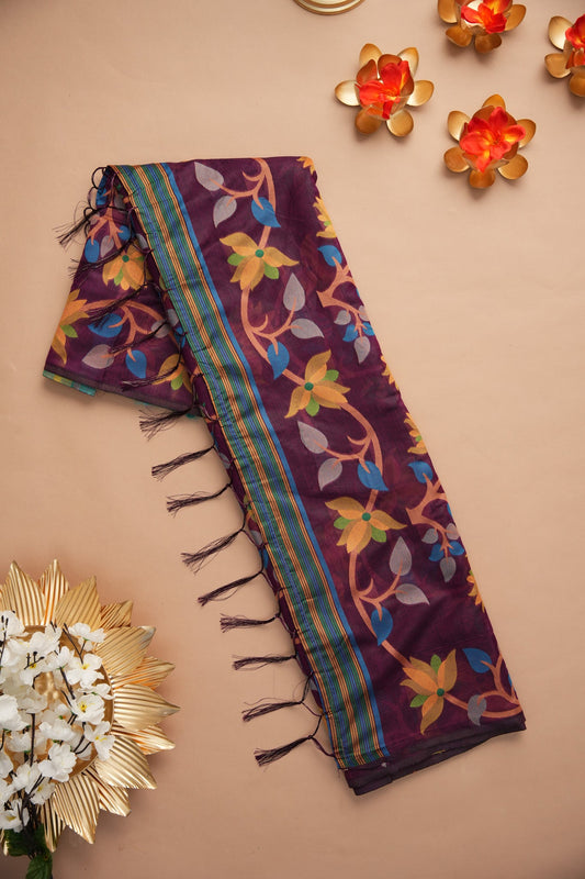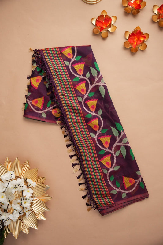 Dhiyona GR Women's Ghazal Classic Couture Wine Cotton Jamdani Saree