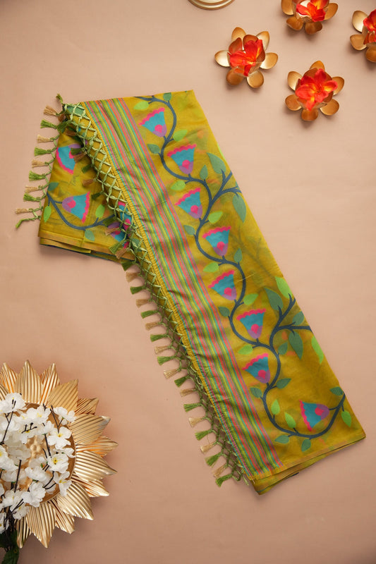 Dhiyona GR Women's Kora Silk Olive Green Organza Jamdani Saree