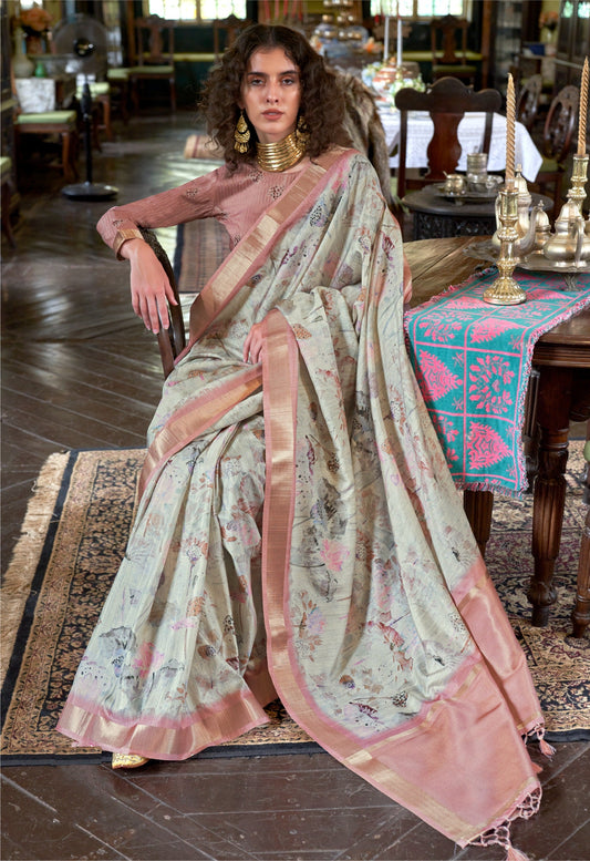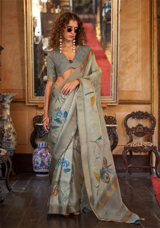Dhiyona GR Women's Queen Grey Banarasi Digital Soft Silk Saree