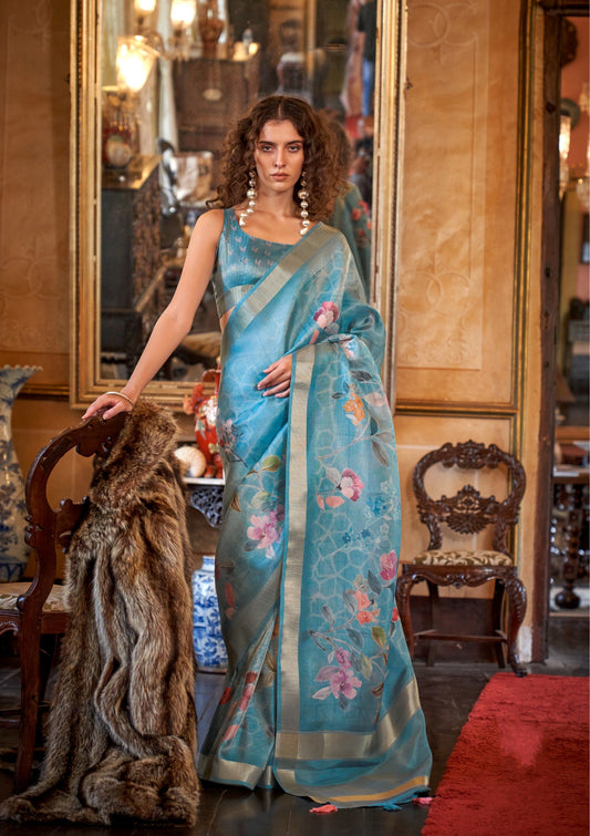 Dhiyona GR Women's Luxuria Blue Banarasi Digital Soft Silk Saree
