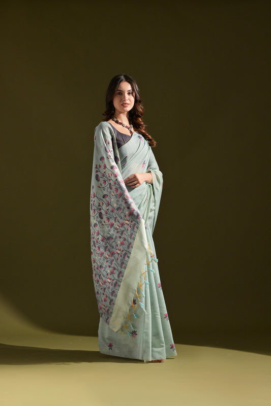 Dhiyona GR Women's Florance Green Muga Cotton Jamdani Saree