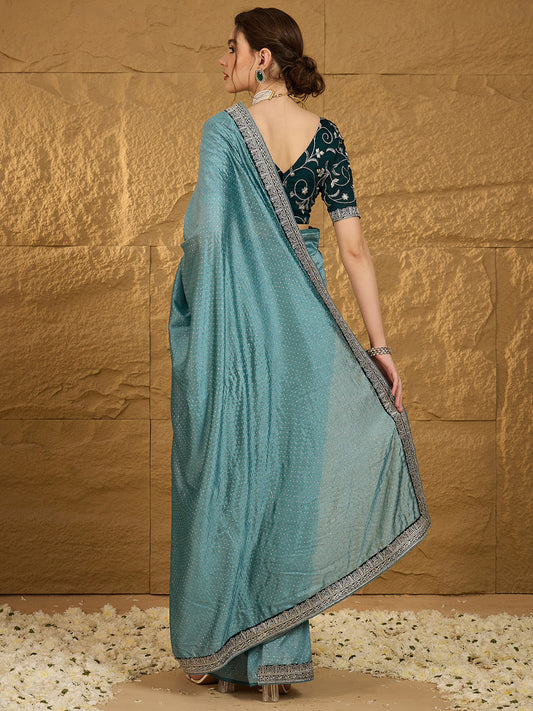 Women's Vichitra Silk Teal blue Embroidered Designer Saree With Blouse Piece