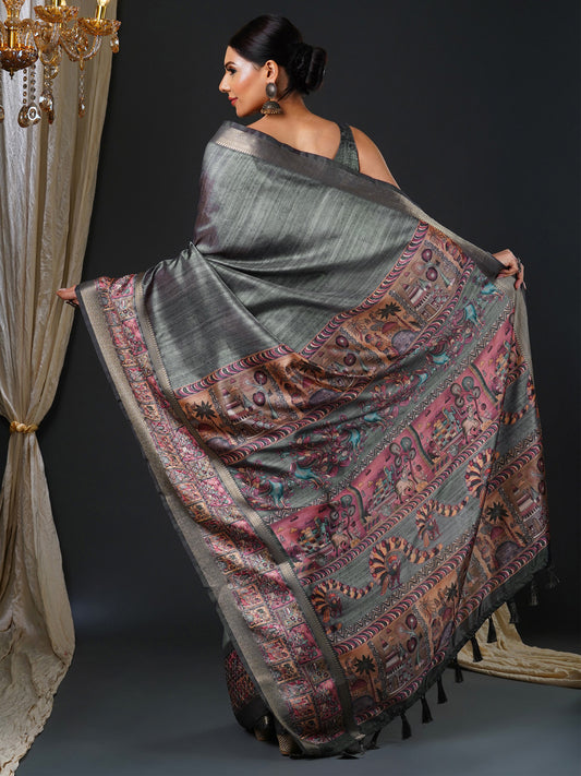 Women's Mysore Silk Charcoal Grey Printed Designer Saree With Blouse Piece