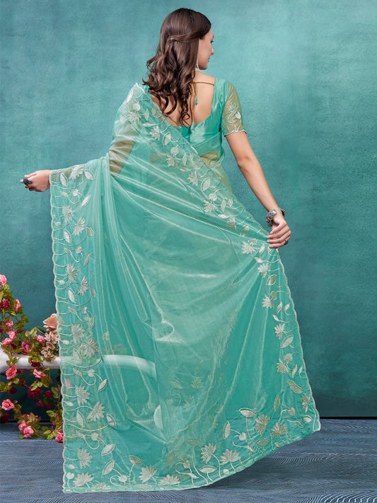 Vendor:Dhiyona SMWomen's Organza Turquoise Embellished Designer Saree With Blouse PieceRegular price $66Regular priceUnit price / per$116Sale price $66 43% off40%