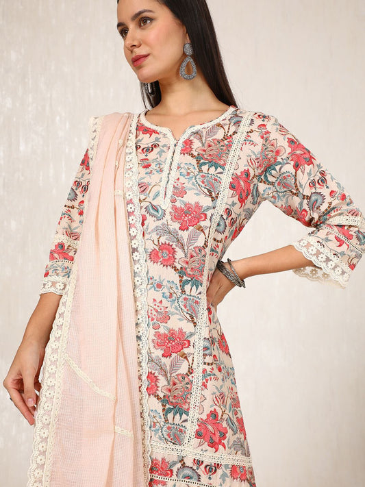 Dhiyona SO Women's Floral Embroidered V-Neck Chanderi Cotton Straight Kurta With Palazzos & Dupatta