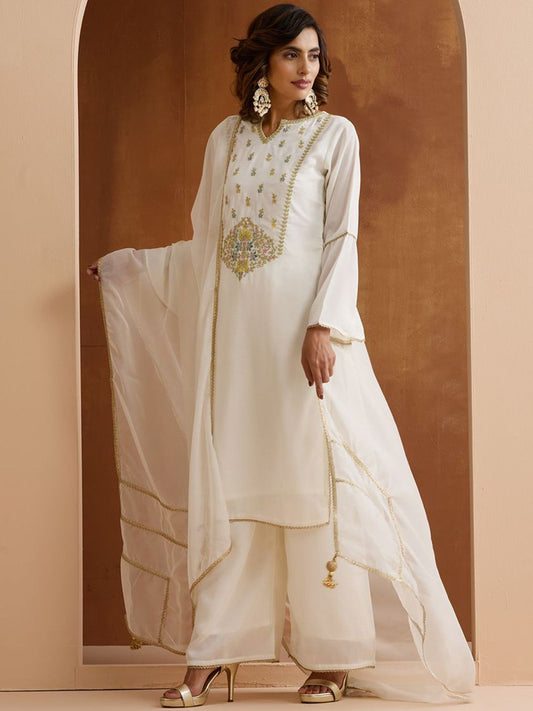 Dhiyona IS Women's Floral Embroidered Yoke Design Notch Neck Sequinned Kurta With Palazzos And Dupatta
