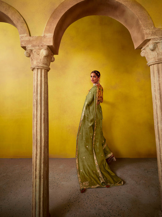 • Dhiyona KM Women Olive Green Saree : Heritage And Elegance