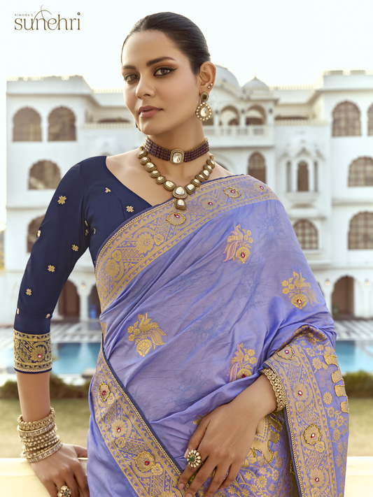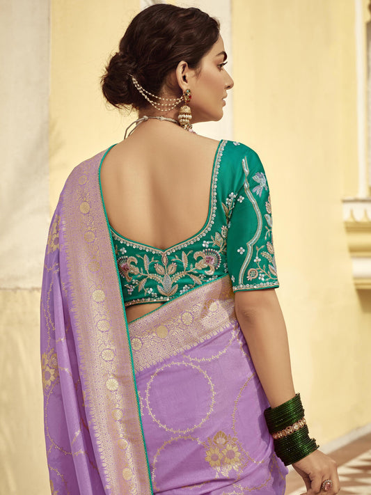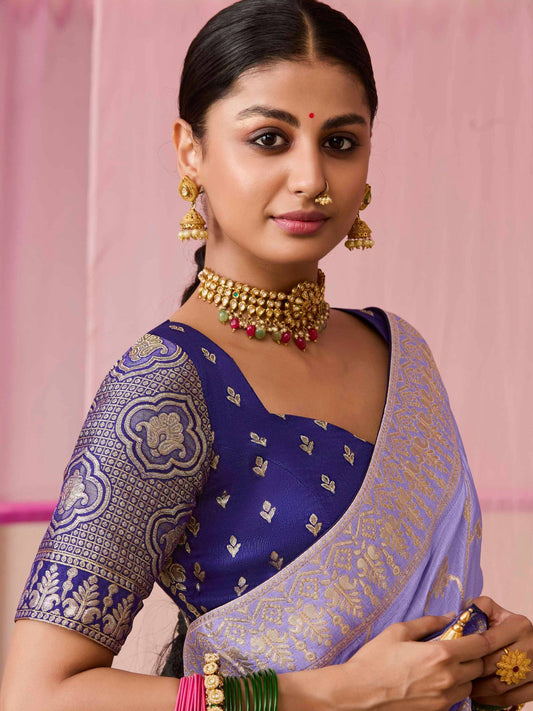 Dhiyona KM Women Lavender Banarasi Silk Saree With Blue Contrast Blouse