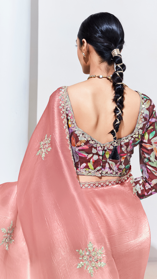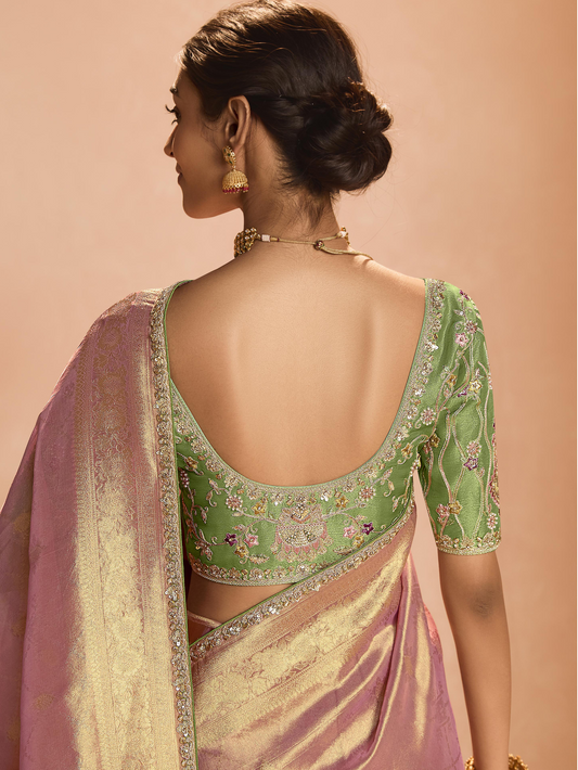 Dhiyona KM Women Peach Pure Tissue Silk Saree With Crushed Texture & Contrasting Green Blouse