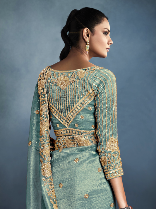 Dhiyona KM Women Sea Green Tissue Embroidered Fancy Heavy Border Saree
