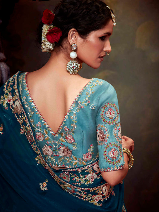 Dhiyona KM Women Teal Blue Designer Organza Silk Saree With Heavy Embroidered Floral Border And Contrast Blouse