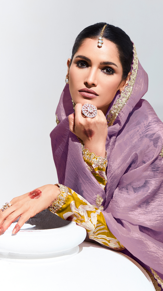 Dhiyona KM Women Purple Pure Tissue Silk Saree With Crushed Texture & Vibrant Yellow Blouse