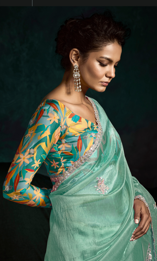 Dhiyona KM Women Teal Designer Organza Saree “ A Blush Of Elegance