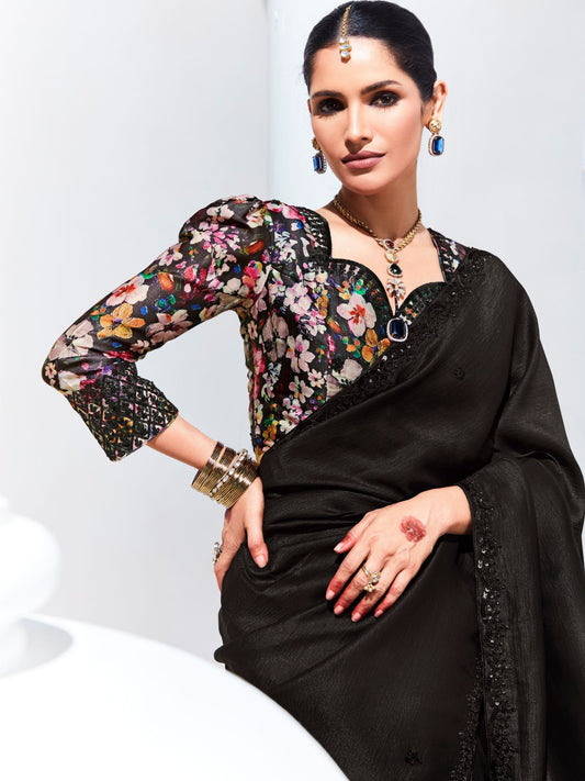 Dhiyona KM Women Black Saree With Floral Embroidered Blouse