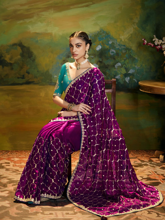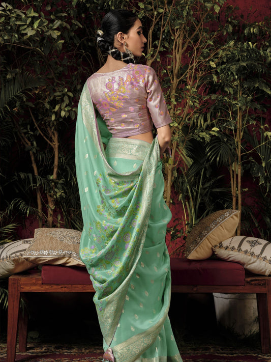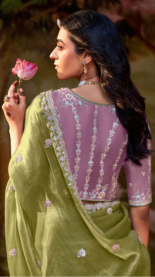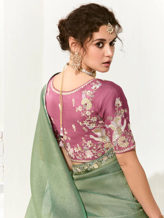 Dhiyona KM Women Mint Green Shimmer Saree With Ornate Mauve Purple Embroidered Blouse