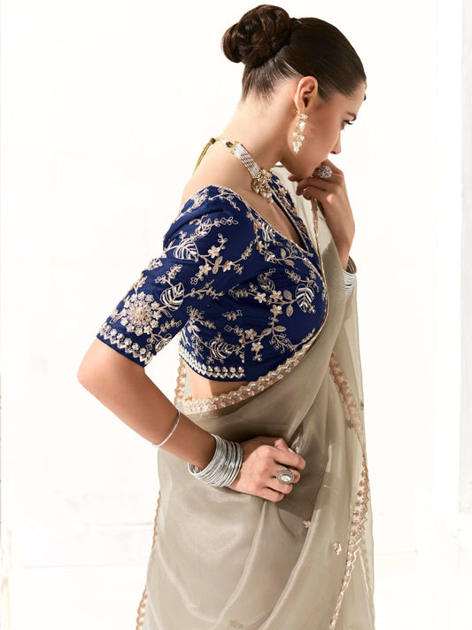 Dhiyona KM Women Royal Grey Saree With Blue Blouse “ Where Elegance Meets Fresh Charm