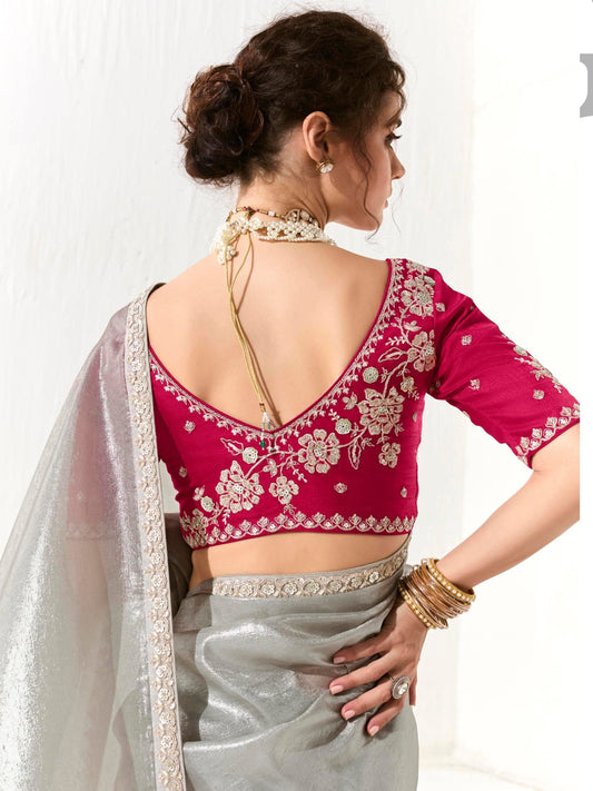 Dhiyona KM Women Elegant Grey Silk Organza Saree With Red Blouse “ Inspired By Shadows & Fire
