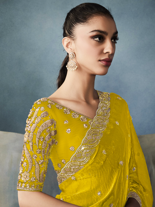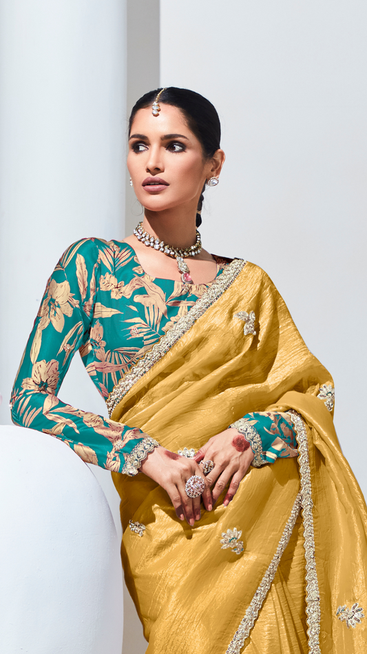 Dhiyona KM Women Yellow Pure Tissue Silk Saree With Crushed Texture & Contrast Green Blouse