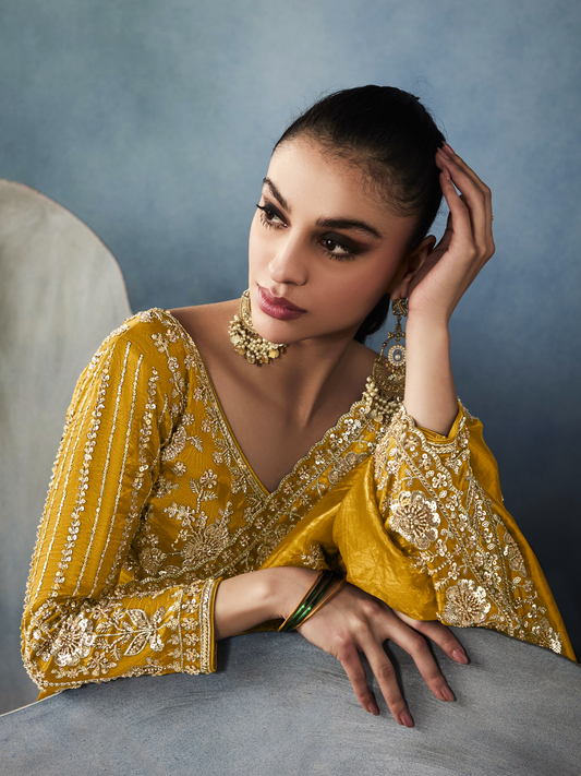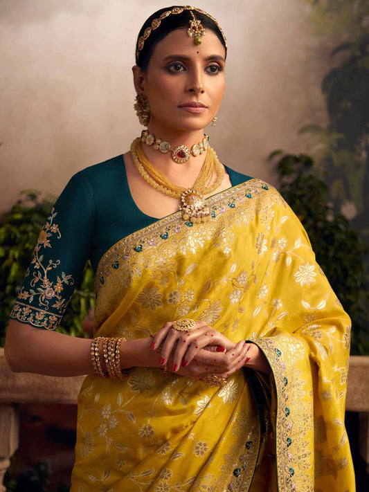 Dhiyona KM Women Vibrant Yellow Silk Saree With Teal Embroidered Blouse