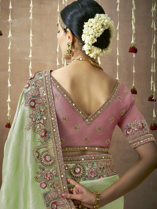 Dhiyona KM Women Green Bridal Pure Tissue Dola Silk Saree