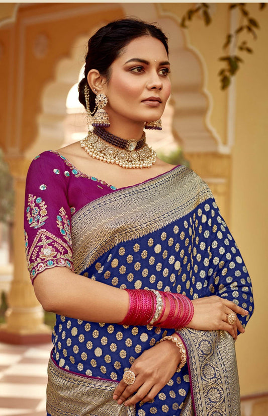 Dhiyona KM Women Royal Blue Banarasi Silk Saree With Zari Weaving